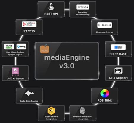 「Media Engine v3.0」 は、プロの現場で使われる主要な映像ファイル形式(MXF、MOV、MP4、TS 等)や、ライブストリーミング用プロトコル(RTMP、RTSP、HLS、DASH 等)に対応しています。更に、放送・編集用途で要求される高品質コーデックや次世代コーデック(HEVC、VVC、JPEG XS など)にも対応可能です。